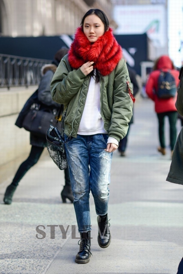 军旅风飞行夹克加上一条红色围巾看起来更加的醒目吸睛。