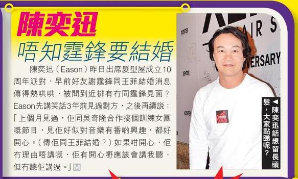 据香港媒体报道 陈奕迅(Eason)昨日出席发型屋成立10周年派对,早前好友谢霆锋同王菲结婚的消息传得沸沸扬扬,被问到最近是否与好友谢霆峰见面?Eason先是讲笑话称3年前见过对方,之后继续说:“上个月见过,他同吴奇隆合作搞个训练女团的节目,见他好像对音乐很感兴趣,都很开心。(有传言谢霆峰将与王菲结婚?)如果开心,他没有理由不跟我讲吧,他有开心的事应该会跟我说,但我没有听他讲过”。
