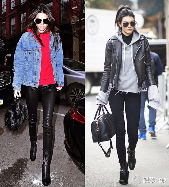 谁的春天里没有件卫衣 最基本最安全的穿法是卫衣(连帽卫衣最佳)配夹克。比如像Kendall Jenner一样连帽卫衣外面穿牛仔夹克、皮革夹克,这种穿法并不新鲜,但贵在活力有元气,而且不过时。