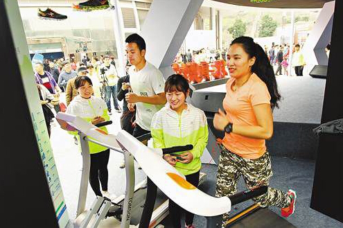 記者看到,幾臺跑步機并排擺放在展區右側,幾名跑友在上面跑得大汗淋漓,他們面前掛著一幅由LED燈拼接而成的“重馬”路線圖。“這是最后一關迷你馬拉松,市民必須以10公里/小時的速度勻速跑,堅持17秒LED燈就會全部點亮,才算通關成功。”工作人員告訴記者,商家在現場還專設了印字機,成功通關的市民,可以獲得跑步專用運動服,還可以將自己喜歡的字、詞或句子印在運動服上。
