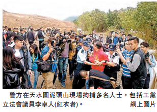 【香港商报网讯】记者万家成报道:天水围嘉湖山庄「泥头山」事件未解决,「土地正义联盟」成员昨清晨企图到场偷挖泥头,带往政府总部抗议,被警方以涉嫌「盗窃」及「行为不检」拘捕7男及1女,当中包括到场声援的工党立法会议员李卓人及土盟执委朱凯迪。发展局局长陈茂波表示,规划署、地政署及屋宇署等都有派人严肃跟进,跨部门正积极跟进中,但蒐证需时。