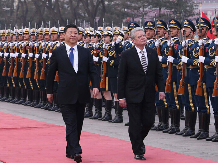 习近平欢迎高克首次对中国进行国事访问。习近平指出,当前中德交流合作紧密程度超过历史任何时期。在双方共同努力下,中德关系发展水平正在迈向更高层次,政治互信持续提升,务实合作不断加深,人文交流更加广泛,在国际和地区问题上沟通协调更加频繁。