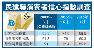 民建联於今年1月5日至18日访问了729名市民,进行第24次「香港消费者信心指数调查」,了解本港市民未来半年对消费前景的信心。结果发现不论是回看过去及现在的「目前状况指数」、展望未来的「消费者预期指数」以及综观过去、现在及将来的「综合消费者情绪指数」,都同告急跌,重回金融海啸时的低水平。