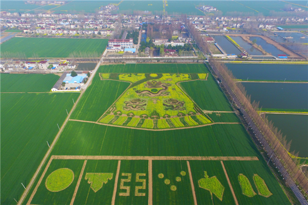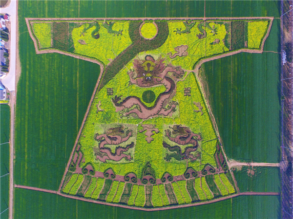3月21日,航拍田野上的“双龙戏珠”迷宫。南京六合油菜花盛开,当地农民加紧制作巨型“龙袍”和“双龙戏珠”迷宫,从空中俯瞰,一幅“游龙戏麦”景观,颇为震撼。