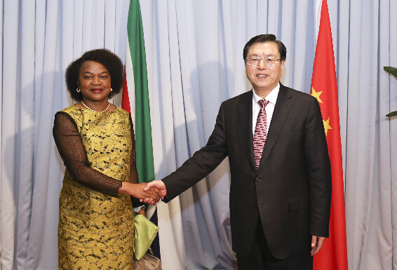 3月20日,张德江在赞比亚首都卢萨卡会见南非议长姆贝特。 新华社