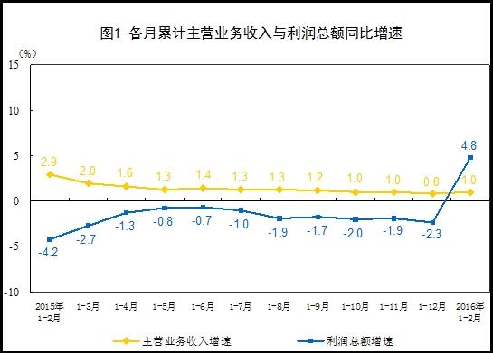 一、工业企业产品销售增长加快。1-2月份,规模以上工业企业主营业务收入同比增长1%,增速比2015年加快0.2个百分点,比2015年12月份提高1.6个百分点(2015年12月份主营业务收入下降0.6%)