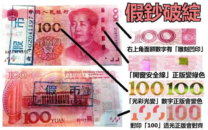 新版「土豪金」100元人民幣有多重防偽特點,但仍有騙徒向高難度挑戰。紹興一所銀行表示,在今月第一次發現1張2015年新版100元人幣假鈔,並指紙質明顯軟綿綿,沒有真鈔的厚實感與質地感,被點鈔機驗出假幣,響起警報。