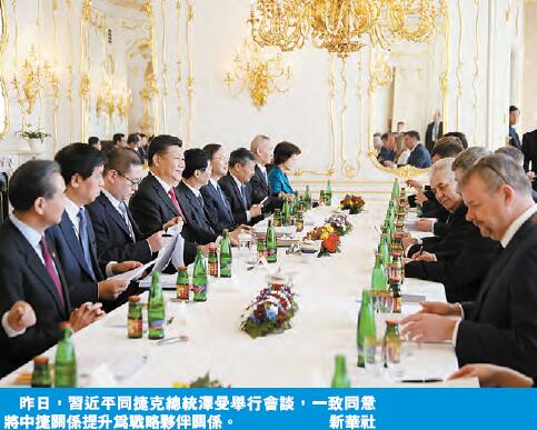 【香港商報網訊】當地時間29日,中國國家主席習近平在布拉格同捷克總統澤曼舉行會談。兩國元首一致同意,將中捷關係提升為戰略夥伴關係,推動中捷關係再上新臺階。雙方同意加強中國「一帶一路」倡議同捷克發展戰略對接,共同編製中捷合作規劃綱要。而前一日晚,習近平還在布拉格拉尼莊園同捷克總統澤曼舉行了會晤。他指出,友誼和合作始終是中捷關係發展的主流,雙方有責任繼往開來,共同傳承和發展好中捷友好關係。