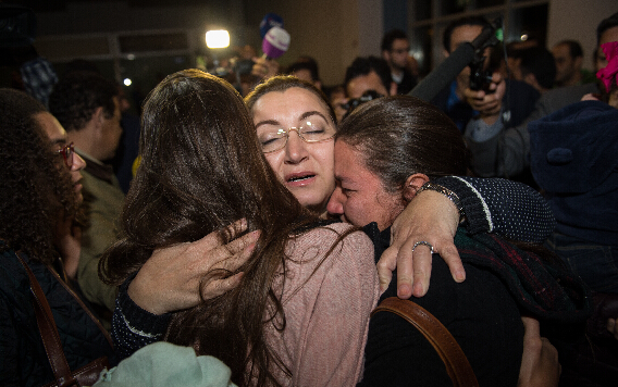 被劫持客机上的两名乘客抵达开罗国际机场后与家人拥抱。新华社