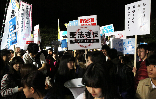 当日,安倍政权强推的新安保法正式实施,标志着日本战后长期坚持的“专守防卫”政策被扫入历史故纸堆,日本一贯标榜的“和平国家”招牌也被摘除。当晚,约3.7万名日本民众在国会前集会,强烈抗议安保法实施并要求立即废除该法。