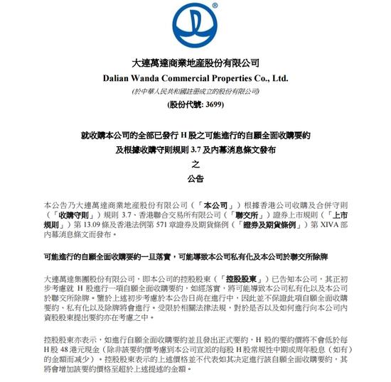 鳳凰財經訊 3月30日消息,萬達商業在港交所發布公告:萬達集團正初步考慮就H股進行一項自愿全面收購要約,萬達集團表示H股的要約價格不會低于每H股48港元現金。