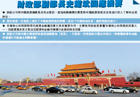 【香港商報網訊】記者伍敏報道:繼評級機構穆迪后,標準普爾(簡稱標普)亦將中港主權評級展望由「穩定」調整為「負面」,財政部副部長史耀斌回應,評級公司對中國經濟擔憂是沒有必要的,認為相關機構仍需要對中國經濟發展及改革進行深入了解和全面評估。
