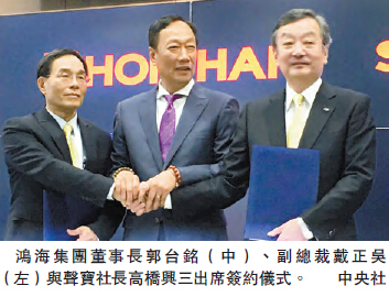 【香港商報網訊】臺灣鴻海集團終於成功收購日本著名家電品牌聲寶(Sharp,內地譯「夏普」),雙方昨日下午在大阪市完成簽約,鴻海集團董事長郭臺銘、鴻海集團副總裁戴正吳、聲寶社長高橋興三均親自出席簽約儀式。