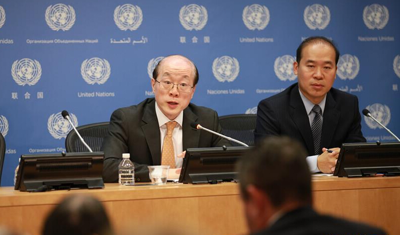 4月1日,在美國紐約,聯合國安理會本月輪值主席、中國常駐聯合國代表劉結一(左)召開新聞發布會,向中外媒體介紹當月安理會工作。