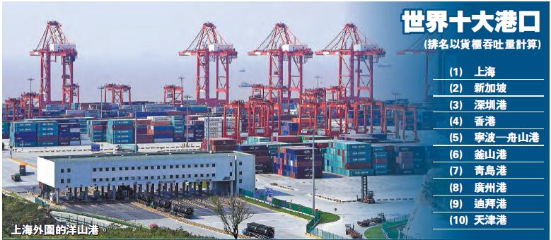 若根据2014年港口货物吞吐量排名,世界前十大港口,中国更占了当中八个:宁波─舟山港第一,上海港第二,天津港第四,唐山港第五,广州港第六,苏州港第七,青岛港第八,大连港第十。其余两个分别为新加坡(第三)和鹿特丹(第九)。近年上海港口吞吐量增长尤其突出,据了解,主要增长来自位於上海外围的洋山港,目前洋山港正在兴建第四期工程,将会是中国首个全自动化货柜码头,工程总投资约139亿元人民币,预计於明年完工,届时上海港年吞吐量有望增长一成三,突破4000万个标准箱,相当於目前全美国所有港口的吞吐总量,也是全球港口年吞吐量的十分之一。