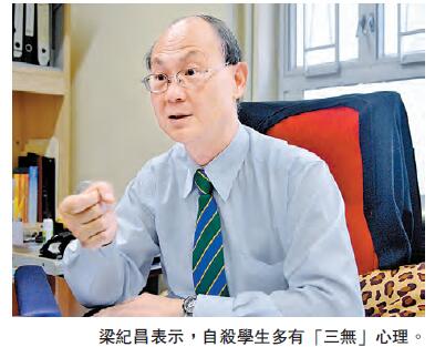 梁纪昌接受中通社访问时直言,选择自杀的学生通常有「三无」心理,觉得自己无能力、无希望、无人帮,而他们通常性格内向,建议父母在子女不同的成长阶段应该采用不同的沟通方式,例如在小学时,多对想让大人开心的学童讲「我挂住你」,中学时多对处於反叛期的他们讲「我明白你」,大学时则需要向面临诸多压力的子女多讲「我支持你」。