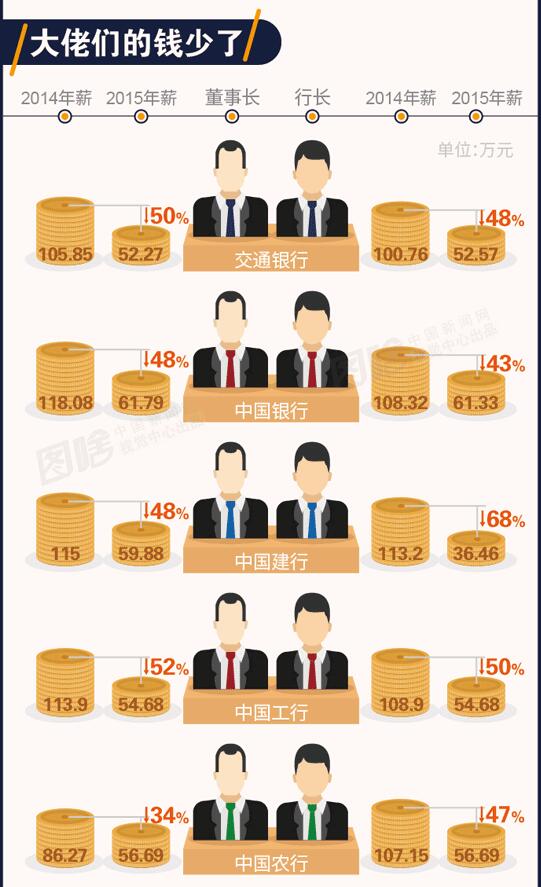 截至3月30日,中国银行[0.00% 资金 研报]、工商银行、建设银行[-0.21% 资金 研报]以及交通银行[1.08% 资金 研报]分别发布了2015年年报。相关年报披露,2015年上述四家国有银行的高管年薪较2014年均有不同比例的下降,部分银行高管的薪酬甚至遭“腰斩”。