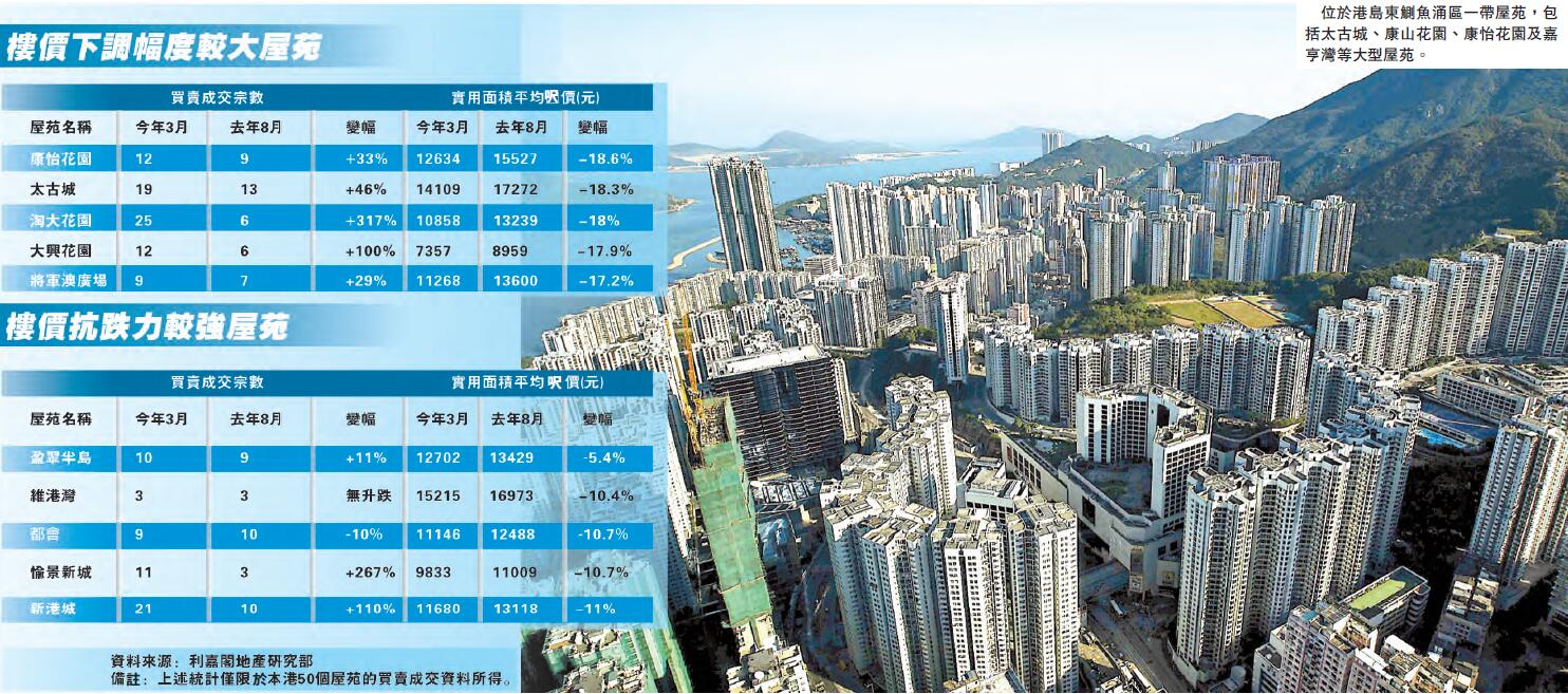 事實上,樓價調整6個月至今,中產家庭集中的大型屋苑一直處於「領跌」之列。就中原地產日前發表的報告顯示,鴨昪洲海怡半島至今累計跌幅便達到18%,領先於港島區整體14.1%的跌幅,而馬鞍山新港城亦見下跌17.2%,高於新界東12.1%跌幅。不過,報告指出,臨近商業區的屋苑跌幅相對較少,其中西區泓都及灣仔尚曉峰僅分別下跌9.5%及4%,而九龍西美孚新恏更只跌4%。陳海潮認為,基於商業區具有企業及辦公室集中優勢,市民對當區屋苑存在一定住屋需求,因此對區內屋苑樓價帶來支持作用。