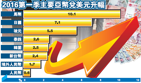 韓圜是3月匯率上揚幅度最可觀的亞洲貨幣,升幅達8.2%,然後是馬來西亞林吉特的7.8%,再其次是新加坡元的4.3%和新臺幣的3.4%;不計日圓,十種亞洲貨幣平均升值也有3%。對此,特里維迪指出,在剛剛結束的第一季度中,伴隨商品價格反彈和聯儲局發出加息進程遲緩信號後的美元走低,亞洲貨幣實現了至少是1999年以來最強勢的單月上漲。