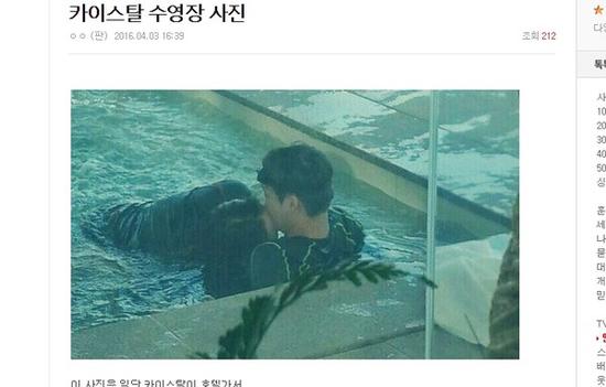 韩国网友在《Pann》论坛爆料,表示Krystal和Kai曾一起到江原道某家饭店约会,还加码上传1男1女在游泳池边接吻的照片,直指照片的主角就是Krystal和Kai,消息一出,立刻就被疯传,掀起一阵热议。