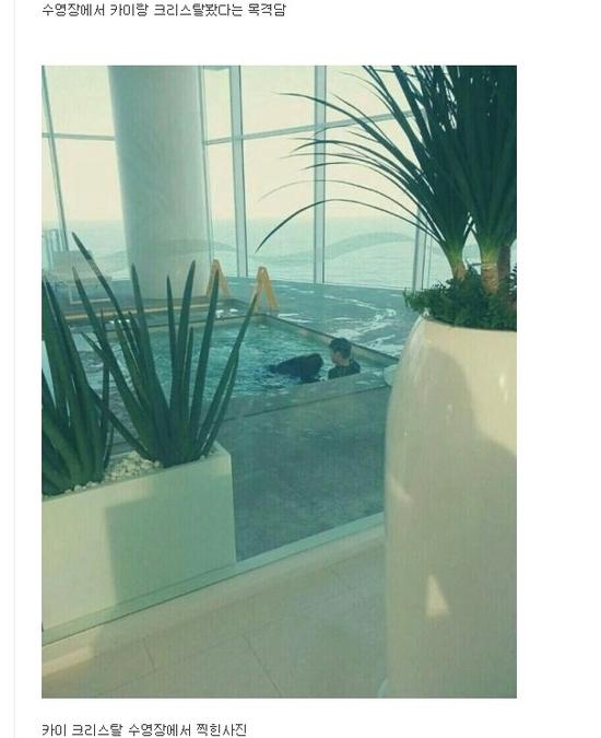 有网友爆出Krystal与Kai在饭店泳池接吻的照片