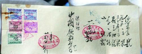 时任中国颜料厂负责人陈介夫经理在春和楼宴请客人时留下的一张票据,相当于现在吃完饭结账后的发票。票据右侧是毛笔书写的菜品及价格,左边则是缴纳的印花税票,印章上刻着“天津路三号青岛春和楼利记”以及四位数的电话号码。据毕连奎介绍,当时的发票有个特点,印花税票全都贴在票据正面或者背面,相当于为这次消费承担了多少税费,一目了然。