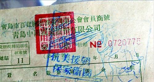 具有鲜明时代特色的发票,印章上是美国大兵被刺穿鼻子的图案。