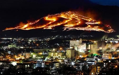 日本举行壮观“扇山火祭”。