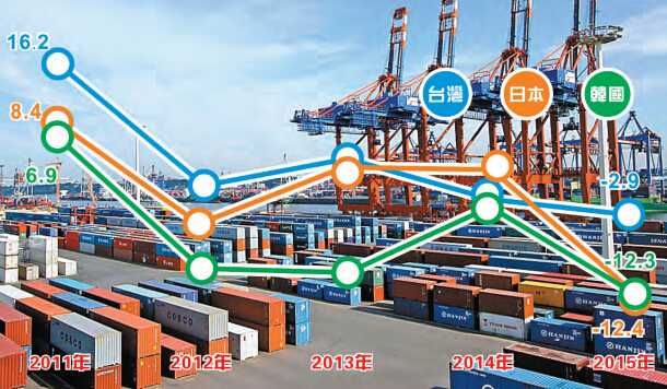 統計處還指出,按各國(或地區)對大陸及香港出口占大陸出口比重觀察,臺灣由2011年的40.3%降至2015年的39.4%,下降0.9個百分點;日本由24.9%降至23.1%,計下滑1.8個百分點;韓國由29.7%升至31.8%,計上升2.1個百分點。顯示臺灣對大陸及香港之出口依存度高於日韓,而韓國對大陸及香港出口比重則有逐漸增加趨勢。