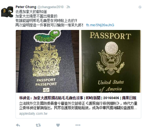 然而,在社交媒體上,卻也有網友對林提交的例證提出了質疑。網友@Peter Chang 表示,加拿大出境并不需要蓋章;此外,林也并不能證明毛毛蟲貼上護照的真實時間。
