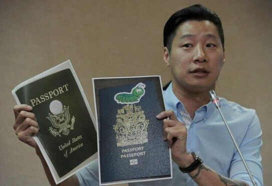 林昶佐展示加拿大與墨西哥護照貼紙的證據