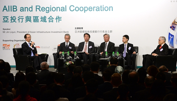 4月7日,亞洲基礎建設投資銀行行長金立群(右三)出席“中華大講堂”活動。當日,亞洲基礎建設投資銀行行長金立群出席由團結香港基金主辦的“中華大講堂”活動時表示,香港作為國際金融中心,在公司管治及專業標準等方面具備很高水平,亞投行的成立對香港來說是個不容錯過的機遇。新華社記者呂小煒攝