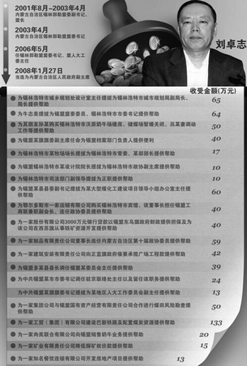 內蒙古自治區政府原副主席劉卓志,曾任內蒙古錫林郭勒盟(以下簡稱錫盟)盟委書記。也是栽到了賣官上面,劉86次收受賄賂817萬元,其中賣官收入占了他受賄金額的大部分。