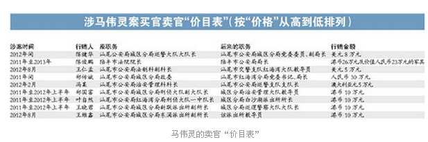比如說汕尾公安局城區分局巡警大隊大隊長陳建華,行賄8萬美元升到副局長。類似的例子不勝枚舉,媒體也干脆替他整理了一份買官賣官價目表。