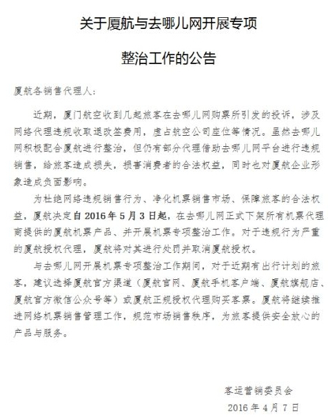 4月7日,廈航宣布自2016年5月3日起,在去哪兒網正式下架所有機票代理商提供的廈航機票產品,并開展機票專項整治工作。對于違規行為嚴重的廈航授權代理,廈航將對其進行處罰并取消廈航授權。