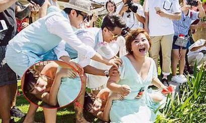 柳岩作为伴娘,在包贝尔的婚礼上被一群男明星抬起,险些被丢进水池。