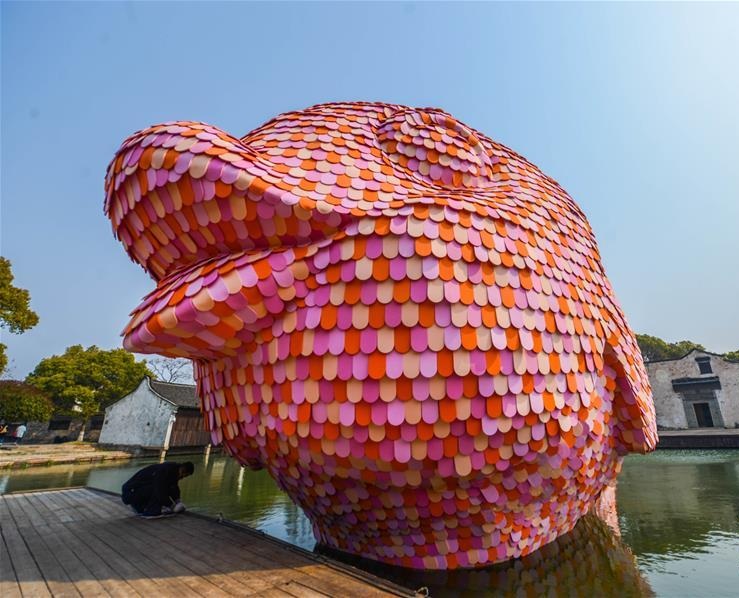 3月27日,粉红色的“浮鱼”首次亮相水乡乌镇西栅景区水剧场。这件作品是“大黄鸭之父”弗洛伦泰因·霍夫曼根据乌镇西栅景区内“水剧场”的空间环境而创作,也是即将开幕的“乌镇国际当代艺术邀请展”的重要参展作品之一。3月28日至6月26日,“乌镇国际当代艺术邀请展”将在浙江省桐乡市乌镇景区内举行,展览汇集来自15个国家和地区的40位(组)艺术家的55组(套)130件作品,包括绘画、雕塑、摄影、装置、影像、动画、行为、声音等多媒介方式。