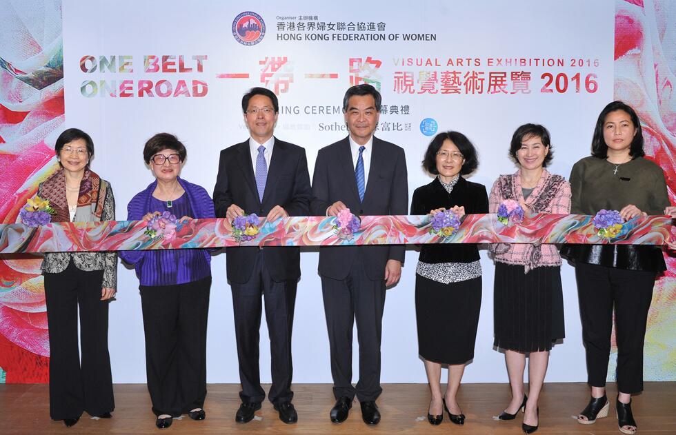 圖:香港特區行政長官梁振英(中)、中聯辦主任張曉明(左三)、外交部駐香港副特派員佟曉玲(右三)、香港婦協創會主席林貝聿嘉(左二)、香港婦協副主席兼視覺藝術展覽籌備委員會聯席召集人黃汝璞(左一)、香港婦協副主席兼視覺藝術展覽籌備委員會聯席召集人及展覽策展人何超瓊(右二)和蘇富比亞洲區主席黃林詩韻(右一)共同主禮展覽開幕式 主辦方供圖