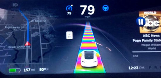 通常情況下,用戶只會在儀表盤上看到一個模擬的特斯拉汽車在行走的畫面。psychedelic cowbell road功能則會通過彩虹色標記汽車傳感器所認知的路線和障礙物等。