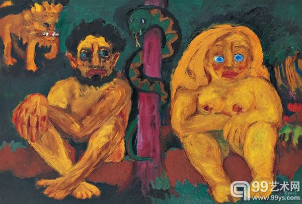 《失落天堂》(Paradise Lost, 1921年) 埃米尔·诺尔德(1867-1956),为德国着名画家、版画家,表现主义代表人物之一。生于1867年8月7日,逝世于1956年4月13日。他是德国着名的油画家和版画家,表现主义代表人物之一。1906-1907年短暂地参加了表现主义画家组织桥社(DieBrcke)。1913年到1914年间他随同帝国殖民局考察团到访俄罗斯、东亚、南太平洋等地,这次旅行对其今后的创作影响很大。20世纪20年代他倾向支持纳粹党,却没得到支持,战后诺尔德重新获得正面评价并多次获奖。 丹尼尔·里希特(DanielRichter)是德国当代架上绘画的代表人物之一,是一名被评论家、收藏家关注较多的当代德国艺术家,90年代后期他的作品跻身于世界拍卖会前列。但面对所谓骄人的成绩,里希特还是保持难能可贵的冷静,贯穿其作品,总呈现着一些新的变化。 在最近几个月,关于埃米尔?诺尔德的纳粹身份引发了热烈的探讨。一方面希特勒认为他的作品是“堕落的艺术”,另一方面人们一直将他视为是纳粹艺术家。其实多年以来他一直想要成为能够代表第三帝国(指希特勒统治下的德国)的艺术家,认为他的艺术是真正的德国艺术,是反法国和反犹太的。马克-克里斯托夫?瓦格纳在路易斯安那现代美术馆(LouisianaMuseumofModernArt)采访了丹尼尔·里希特,后者对于德国表现主义画家埃米尔?诺尔德(EmilNolde)表达了自己的看法。 丹尼尔·里希特:我是个画家,埃米尔?诺尔德也是个画家。画家通常都会对其他画家很感兴趣。我和他都来自德国北部,从小到大我在我的家乡都充斥着埃米尔?诺尔德的画作,因此我从小就对他很感兴趣。 在二战后柏林艺术学院的第一任院长就将诺尔德称为了“纳粹埃米尔”,他很看不起诺尔德。事实上大家早就对于诺尔德的纳粹身份心知肚明,这已经是一个公开的秘密了。而最近人们真正在探讨的并不是诺尔德的纳粹身份问题,而是他能不能作为德国艺术的象征。他的艺术生涯大起大落,一方面他觉得自己被希特勒和纳粹理想所背叛了,另一方面他也成为了德国战后的集体心灵蓝图。 对于我来说最喜欢的是他的作品中的颜色像是能够流淌起来,并且他描绘的人物形象更趋向于抽象,将身体抛之脑后。虽然他说自己没怎么在大城市呆过,但其实他在柏林等城市生活过很长一段时间,经常与舞女在一起,也经常去咖啡馆,他的作品中也经常以此作为主题。在他的作品中你看不到一条街道或是一辆车,甚至看不到一块现代的地方,找不到任何关于他描绘的是什么时代的线索。他在作品中表现的是男人与女人,争议与邪恶,能看出一种阴阳的对抗与交融。他的作品极具个人特色,没有人在那一时代能够超越他,在他作品中的抽象因素在某种意义上超越了美国的抽象艺术,能在他的作品中看到具象的地方,但他想要将具象的地方与抽象融合。在其作品中看不到空间,更像是疯狂版的马蒂斯作品。 埃米尔·诺尔德1906年参加了德国表现主义团体中的桥社。其实他是一个性格有些孤僻的人,但在柏林居住的很长一段时间,他都需要和不同的人打交道,因为他需要参加展览也需要作品有藏家,也需要和其他艺术家交流。我觉得他不是一个很善于和他人打交道的艺术家,他不是很喜欢社交,但他努力在与人交流,也得到了一些艺术家和评论家的支持。虽然他是一位很成功的艺术家,但他与人打交道的时候还是很腼腆。 比起那些家境很好的德国艺术家来说,他来自德国与丹麦接壤的乡下,家里有十几个兄弟姐妹,德语也不是很好,很晚才开始学画,他不是很会社交,只是依靠自己的艺术作品,依靠他在哥本哈根的妻子来为他打点。那时他被希特勒邀请参加展览,他很兴奋,那时他觉得自己在事业的顶端,但没过几年当纳粹失败后,他一下子从云端跌到了谷底。但他从来没有因为别人对他的误解就一蹶不振。 我觉得要单从埃米尔·诺尔德的个人背景来看,他是一个很有自制力的人,他的家庭背景也很平民。在1979年时他开始重新获得艺术家的地位,虽然还是有很多反对他的人,但是他也有很多的支持者。虽然我们现在已经很习惯他创作的这些作品,但是在那个时代要知道德国表现主义的画风是很新颖的,并且有很多人厌恶这样的风格。他在一生中创作的作品有很多藏家,为他带来了很多收入,但他想做的是一个能够真正代表德国艺术的艺术家,这种德国艺术是反法国艺术,反浪漫主义的。 在看一位艺术家的作品时需要了解他的生平吗?现在在评价一个人的时候总是会以别人的私人生活来判断,无论是当今社会上的政治家、演员还是艺术家。我觉得这是不对的,一个艺术家、政治家或者演员不能以他们的私人生活作风等情况来进行评判。一个人的生平对于他的作品来说只能作为参考资料,而不能因此影响你对于他作品的判断力,艺术作品只能根据作品本身以及其它作品来进行判断和评价。和大多数艺术家一样,诺尔德也是一个矛盾体,这一矛盾的人格就像一条红线一样贯穿了他整个人生。很多艺术家都有过错误的想法,但这些错误的想法往往都会产生一些很有趣的结果。