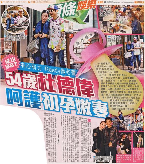 据香港媒体报道,54岁的歌手杜德伟(Alex)与曾任摄影师的太太李晓冰(Ice)结婚三年半,虽然年龄相差24年,但完全无代沟,整天搂着上街,温馨甜蜜。日前下午,杜德伟与嫩妻现身吃饭,杜太太当日胃口很好,吃完碗面、油菜,又同老公一起吃了份鲜油多,离开时,发现杜太太略发福、围巾遮肚孕味浓,而丈夫对她更加呵护备至,扶着上车。其后媒体电话访问李晓冰,问她是否造人成功?她回应:“迟些有消息再讲!”似乎是怕“小器”,不便透露初孕一事!