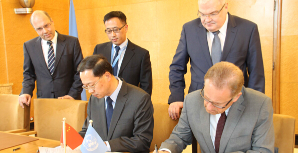 中國常駐聯合國日內瓦辦事處和瑞士其他國際組織代表馬朝旭11日與聯合國日內瓦辦事處總干事穆勒就中國捐建“中國廳”簽署協議備忘錄。捐建項目完工后,這個位于萬國宮內的“中國廳”將成為聯合國系統首個以“中國”命名的會議大廳。
