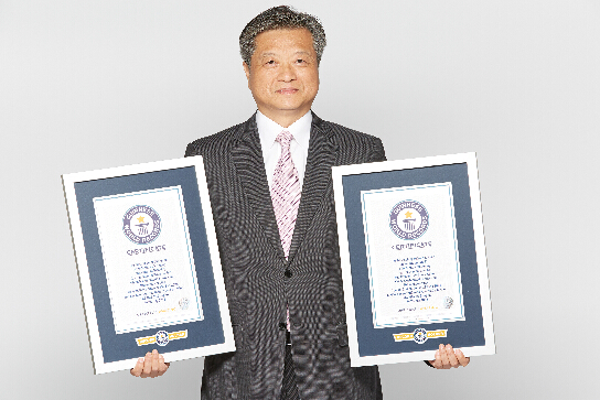 4月12日,在英国伦敦,吉尼斯世界纪录机构高档副总裁马尔科·弗里加迪(左三)向中国出版集团公司总裁谭跃(左二)和商务印书馆总经理于殿利(右二)颁发两个纪录证书。