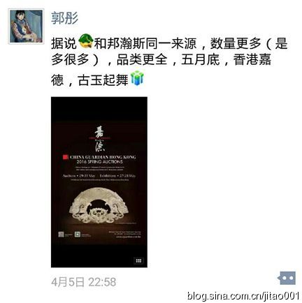随后,中国嘉德拍卖公司副总经理郭彤在其微信中发布说:“据说和邦瀚斯同一来源(是多很多),品类更全,五月底,香港嘉德,古玉起舞。”其意是说,香港嘉德也将上拍古玉专场,货源也是“思源堂”主人!据媒体报道,“思源堂”主人名为何安达,是著名收藏家、古董商陈淑贞的先生。陈淑贞女士在移居香港之初曾加入东方陶瓷学会,2014年12月因病去世,倾其一生创办的奉文堂藏品只能交由何安达处置了。