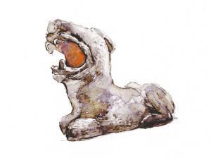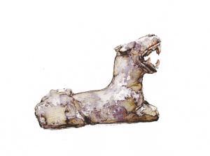 2001年发掘时,考古工作者在金沙遗址出土了大量石器,其中以12件跪坐石人像与10件立体圆雕石虎最为传神。现在,游客同样可以在金沙遗址博物馆中观赏到这些3000年前富于狞厉之美的艺术品。石虎大张方口,肌肉遒劲,眼睛、耳部和嘴部都涂有鲜明的朱砂。出土时,石虎张开的大嘴正对着跪坐石人像的胸部,旁边还摆放着一件石蛇和一些石璧。这应该是一种特殊的祭祀行为。