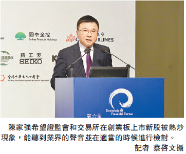 而就近期創業板上市新股被熱炒的現象,陳家強表示關注的問題有幾種:一是有時候會出現所謂「爆升」或炒賣的活動,另一是在創業板上市的公司質素,或者整體的流通量方面這些比較大的問題,陳家強希望證監會和交易所在這方面能聽到業界的聲音并在適當的時候進行檢討。
