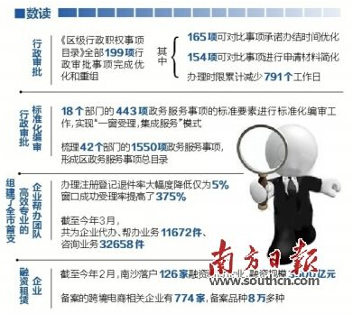 在深化商事登記制度改革,南沙率先推行“綜合受理”新模式,一個窗口遞交材料,要求12個部門24小時內完成,“有些改革甚至需要省領導來協調”。一位參與改革的公務員也感慨地說,為了確保改革能同步,經常需要督促相關部門及時反饋。