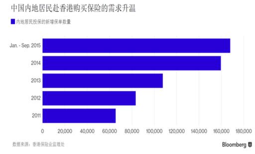 2014年内地人士在香港投保的保费金额创下244亿港元(31亿美元)纪录高位,同比增长64%,较2012年增长146%。香港保险业监理处称,去年前九个月香港新增保费中有22%来自内地投保,较10年前增长了近五倍。