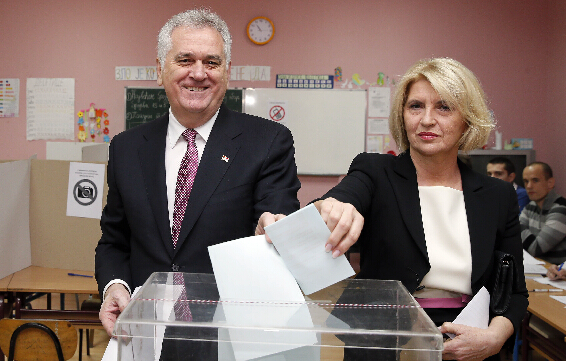 塞尔维亚总统尼科利奇(左)和妻子德拉吉察在投票站投票。