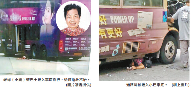 【香港商报网讯】记者区天海报道:长沙湾及上水昨晨在不足两小时内先後发生涉及长者的夺命车祸,两名老妇同遭卷入车底死亡;其中一辆九巴在李郑屋对开广利道行驶时,将一名八旬老妇撞倒卷进车底,司机懵然不知将其拖行近200米始停下,老妇大腿血肉模糊重伤,送院抢救後不治;另一名老妇则在新发街被小巴撞倒再被辗过卷进车底,同样不治死亡,两名司机同涉危险驾驶引致他人死亡被捕。